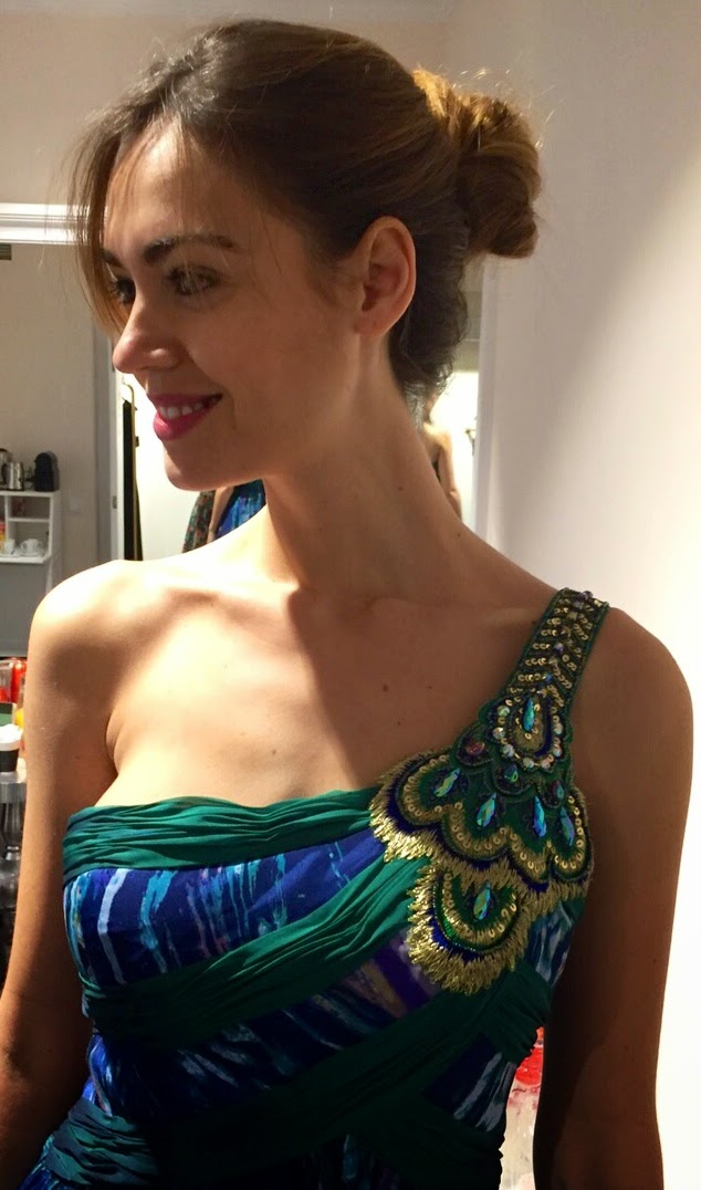 Vestido largo con escote asimétrico en tonos azules y verdes. Detalle de pavo real en el tirante ¡Absolutamente ideal! Pertenece a la colección Barbarella Luxe. Al fondo de la imagen de la derecha, Barbarella Novias y Hadita Barbarita