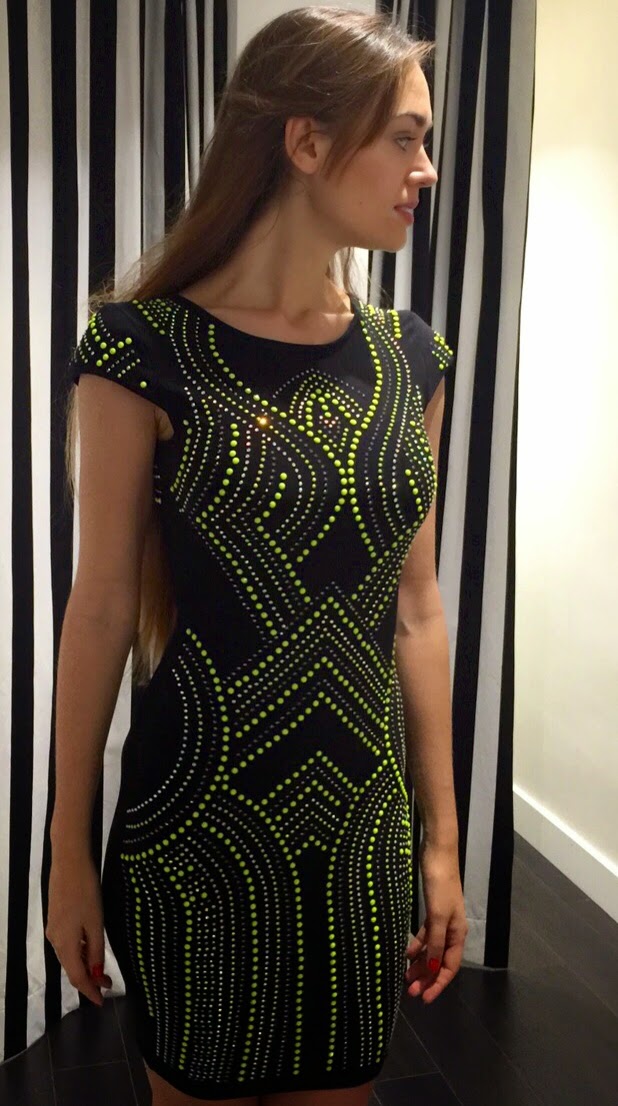 Precioso vestido negro de cóctel con aplicaciones en amarillo flúor. El dibujo realza las líneas del cuerpo de la mujer por lo que el efecto óptico es de unas caderas disimuladas y una cintura más estrecha.