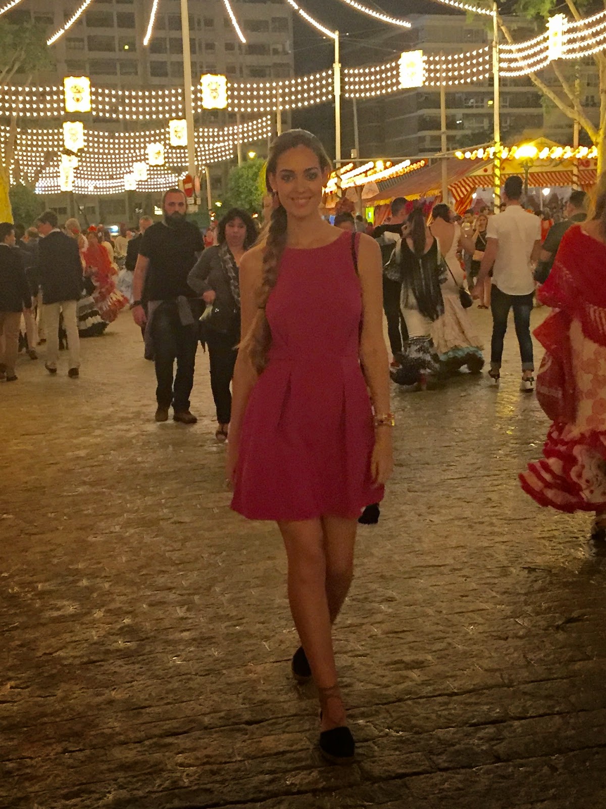 Ya os comenté en el post anterior que en esta ocasión no iba a vestirme… y me dió mucha pena. Aun así quise elegir un vestido adecuado para pasear por la feria de día. Hacía mucho calor, así que me decidí por un vestido corto de Morgan de Toi en color fucsia y con la espalda abierta en encaje negro. Para los pies, rescaté unas alpargatas negras atadas al tobillo que tengo desde hace tiempo. Sin duda son la mejor opción para caminar por el albero y por las calles adoquinadas.